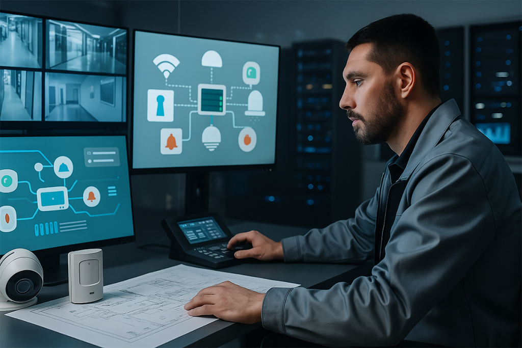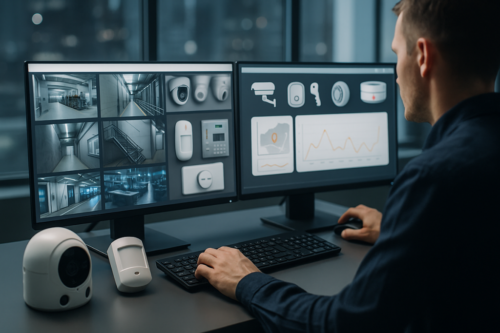 Concebemos e implementamos sistemas de segurança integrados, onde todos os dispositivos (câmaras, sensores, alarmes, etc.) comunicam entre si através de uma plataforma centralizada.